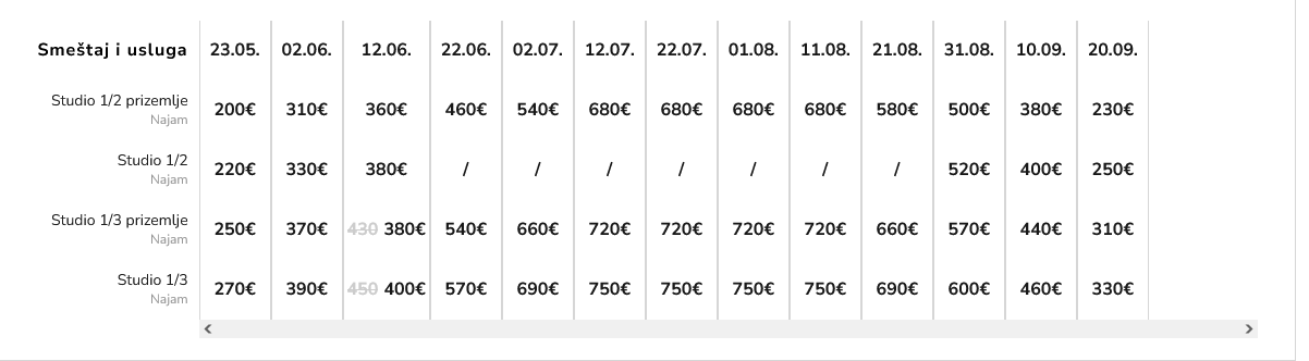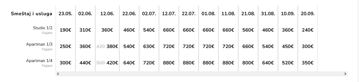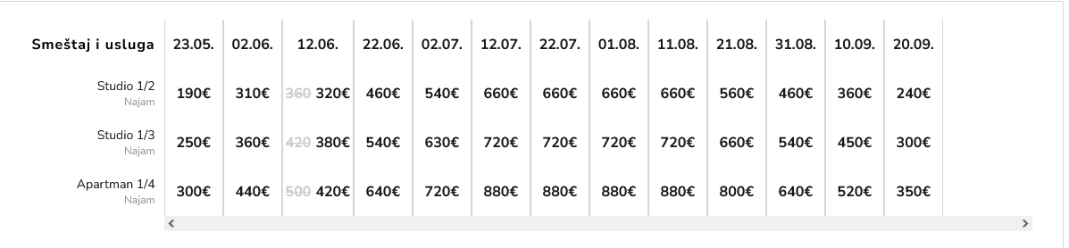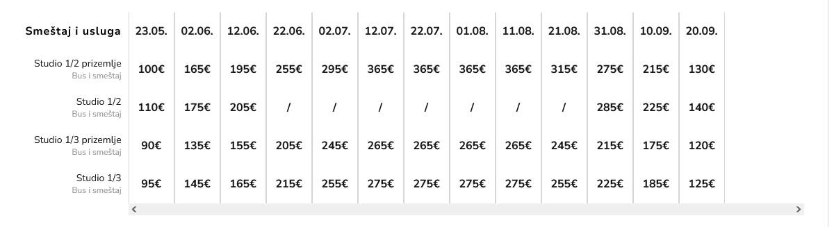 - prilikom spajanja smena prva smena se plaća prema cenovniku za autoubski prevoz (po osobi) a druga smena prema cenovniku za najam apartmana (ukupno)