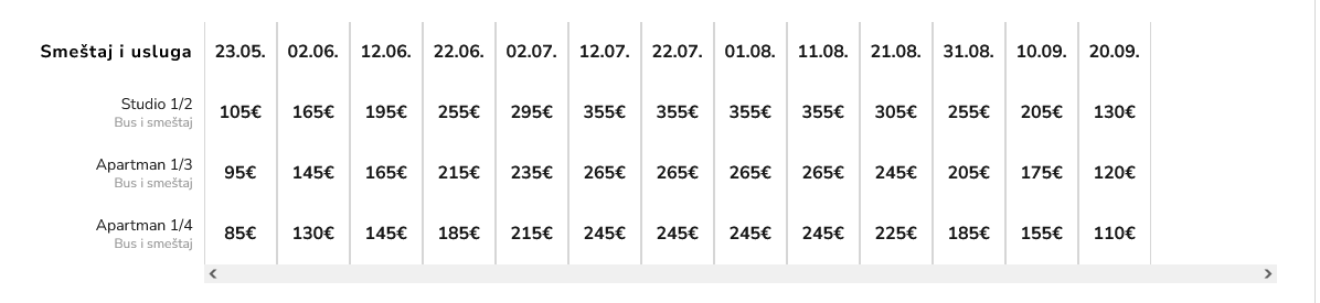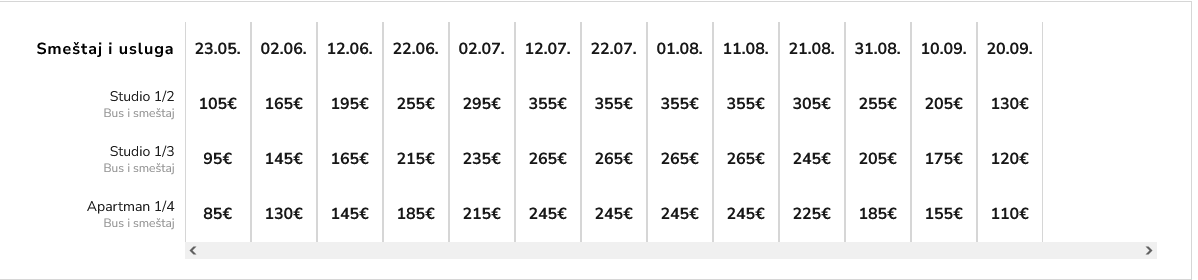 Cene su izražene u eurima po osobi na bazi 10 noćenja sa autobuskim prevozom. Termin označava datum polaska iz Beograda